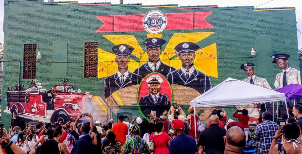 • Member Sir James Thornhill along with artists Jason Ford and Kevin Orlonsky completed a mural to honor Richmond, Virginia's first 10 black career firefighters in Engine Company Number 9, who were hired July 1, 1950. The mural can be seen on the wall of Mocha Temple No. 7 Shrine Club in Jackson Ward on 2nd Street, a few blocks from where Engine Co. No. 9 was located until 1968. The mural was officially unveiled on August 6. Read more about this mural here or check out the Facebook page.